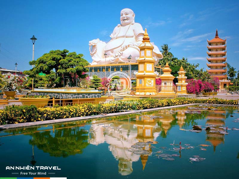 8h00: Đến Mỹ Tho, quý khách thăm quan Chùa Vĩnh Tràng. Sau đó, quý khách lên thuyền tham quan những bè nuôi cá nổi trên sông Cửu Long bằng thuyền lớn, tìm hiểu nghề nuôi cá của dân địa phương, ngắm cầu Rạch Miễu.